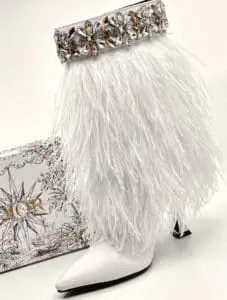 Dancing along the tops of the boots are dazzling diamond accents that catch the light with every movement and step. These sparkling gems add a touch of glamour and opulence, making you feel like a true fashion icon. Complementing the diamonds are delicate feathers that sway with each step, adding a hint of whimsy and playfulness to your ensemble.